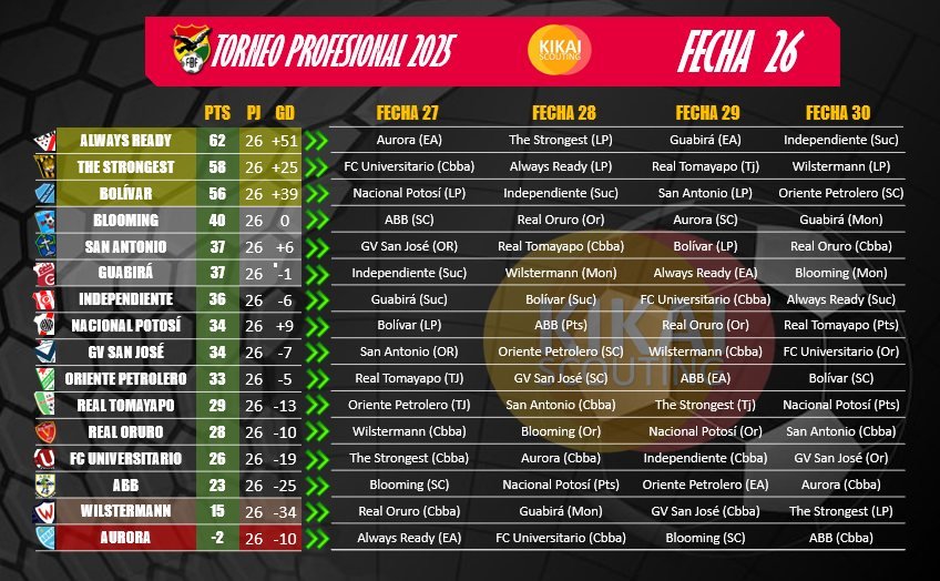 - Visitante vs. FC Universitario: Un viaje corto a Cochabamba ante un rival que pelea en la parte baja.