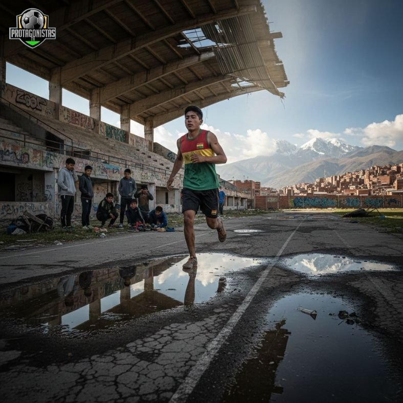 Aquí, una imagen que ilustre las condiciones precarias en las que a menudo entrenan los deportistas bolivianos. Podría ser un atleta en una cancha improvisada o un coliseo deteriorado.